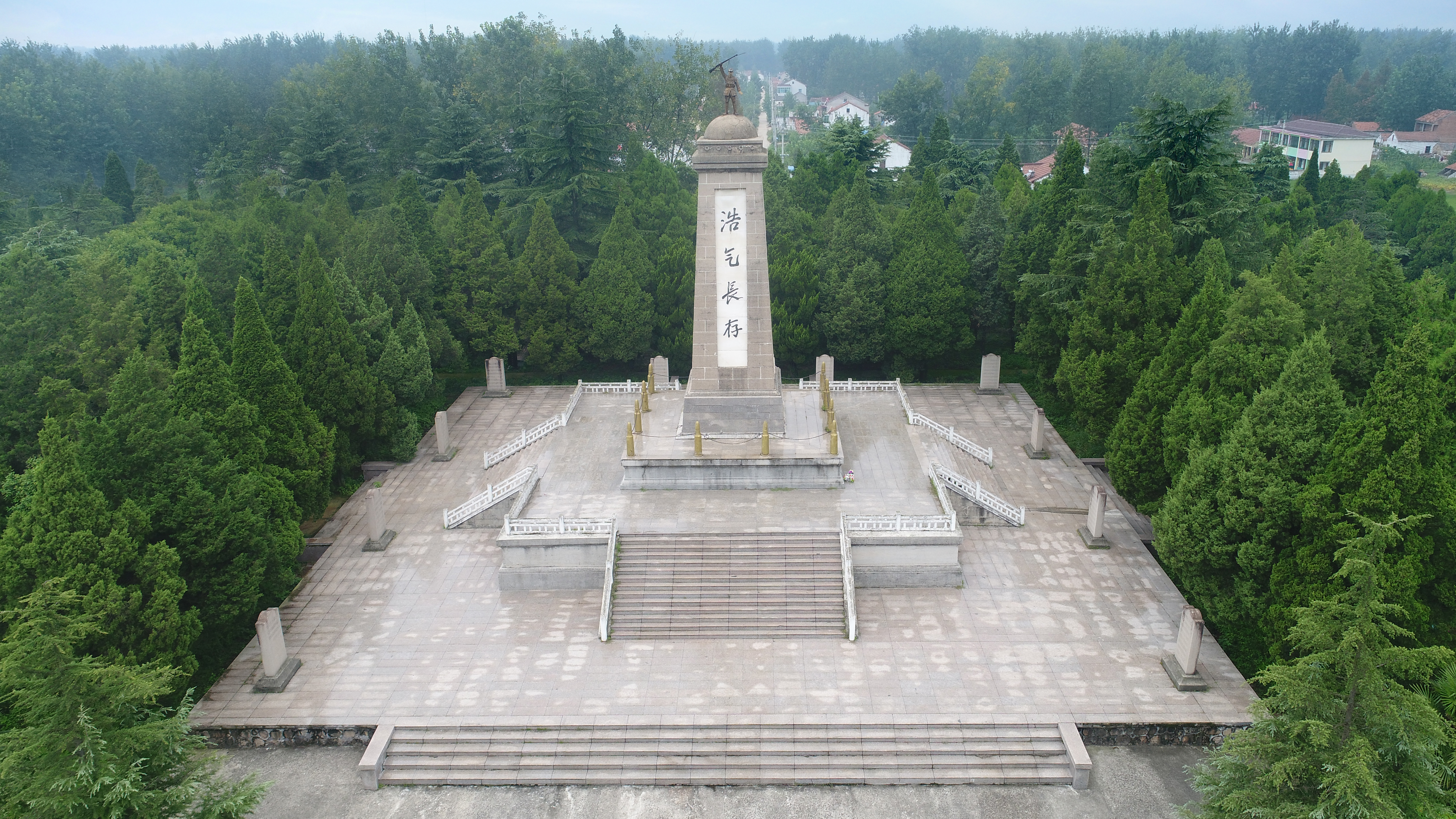 新四军盐阜区抗日阵亡将士纪念塔位于盐城市阜宁县芦蒲镇芦蒲村二组,座落在苏北灌溉总渠西侧、黄河故道东畔。1943年,盐阜区行政公署决定建造此塔,6月15日开工,9月4日竣工并对公众开放,以纪念在盐阜地区进行抗日的阵亡将士。该塔占地面积36.6亩。塔基地水平面上第1层32.1×32.56米,平台高1.15米,平台的北、西、南三面建荣哀录纪念碑10块,镌刻1749名烈士英名。第2层平台平面14.6×14.06米,平台高2.6米。第3层即最上面一层为塔身底层,平台高1米,四边宽为7.1×7.1米,各边离塔正身2米四边各立1.5米高的朝天炮弹4发,计12发,形似守塔的巨人,炮弹与炮弹之间用铁链串连在一起。塔基四面,从地坪到第1层平台有5层砖彻的踏步台阶(寓意为原八路军五纵队部队) ,第1层平台到第2层平台共有12层砖砌踏步台阶(寓意八路军“8”、新四军“4”胜利会师后(8+4=12)整编为一个部队新四军) 。塔的正面镌刻着刘少奇题写的“浩气长存”四个大字,顶部安放新四军持枪战士塑像,塔的背面镌刻着陈毅题写的“国民革命军陆军新编第四军盐阜区抗日阵亡将士纪念塔 盐阜区士绅民众恭建 蜀北陈毅沐手敬书 一九四三年十月八日”等。该塔具有重大的历史、艺术、科学价值,弘扬党的革命传统,发挥了党史存史、资政、育人重要作用,也从侧面反映了盐城深厚重实的红色历史。